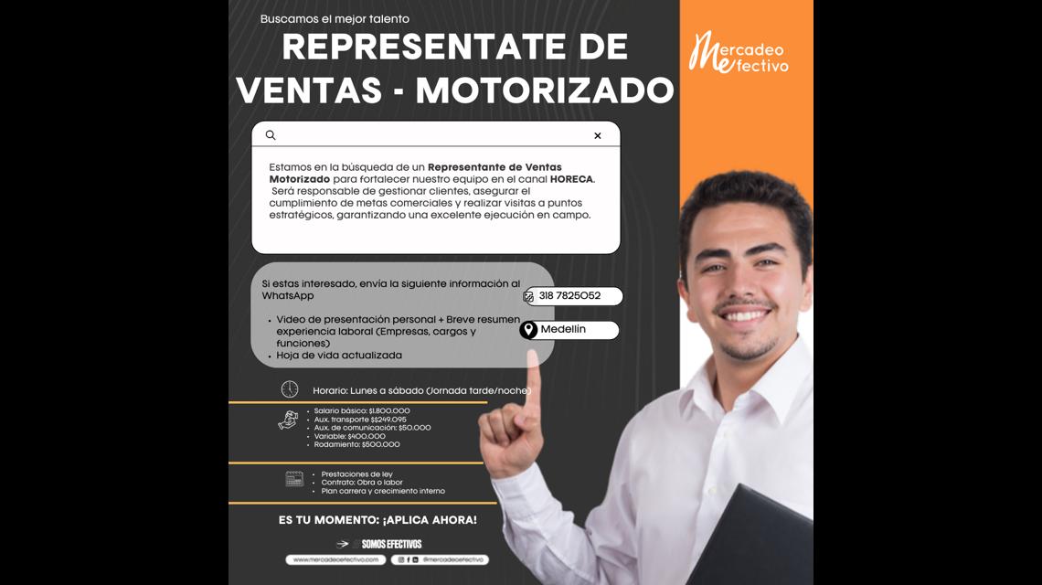 Actualmente en Mercadeo Efectivo S.A.S nos encontramos en la búsqueda de un Representante de Ventas o Asesor Comercial Motorizado para fortalecer nuestro equipo comercial en el canal HORECA con una de las empresas de bebidas más reconocidas a nivel nacional. Serás responsable de gestionar el portafolio asignado, visitar clientes estratégicos, impulsar el cumplimiento de metas comerciales y garantizar una ejecución efectiva en campo. Buscamos profesionales con actitud comercial, excelentes habilidades de comunicación y experiencia mínima de 1 año en ventas externas.